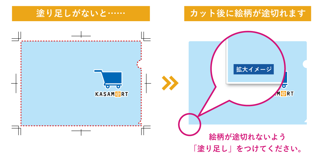 塗り足しがあると、絵柄が途切れずきれいな仕上がりとなります\(*^▽^*)/