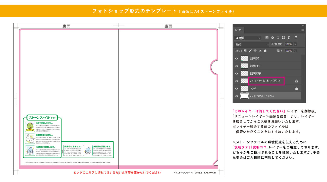 最終的に、このピンクのエリアが表示されている「このレイヤーは消してください」は消した状態でレイヤーの統合をお願いします。