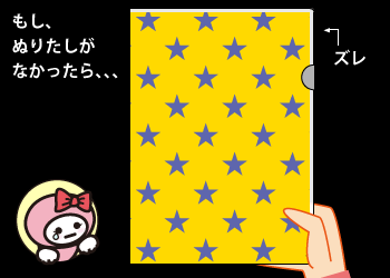 また印刷物の端いっぱいにまでデザインを広げたい場合、実際の仕上がりサイズよりも上下左右3mm外側の位置まで大きく、絵柄を作成する必要があります。この伸びしろ3mmの部分のことを『ぬりたし』と言います。ぬりたしがあるおかげで、断裁時にわずかにズレが生じても、絵柄が途切れて製品の品質に差ができにくく、よりキレイな仕上がりになります。