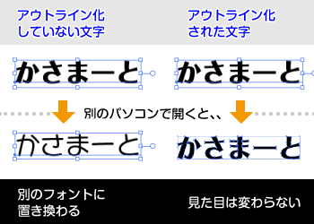 ゴシック体や明朝体など、世の中にはたくさんの書体データ(フォント)が存在します。しかし、全てのパソコンに同じ書体データが搭載されているとは限りません。もし、その書体がない別のパソコンでデータを開くと、自動的に適当な書体に置き換えられてしまい、デザインの見た目が変わってしまいます。